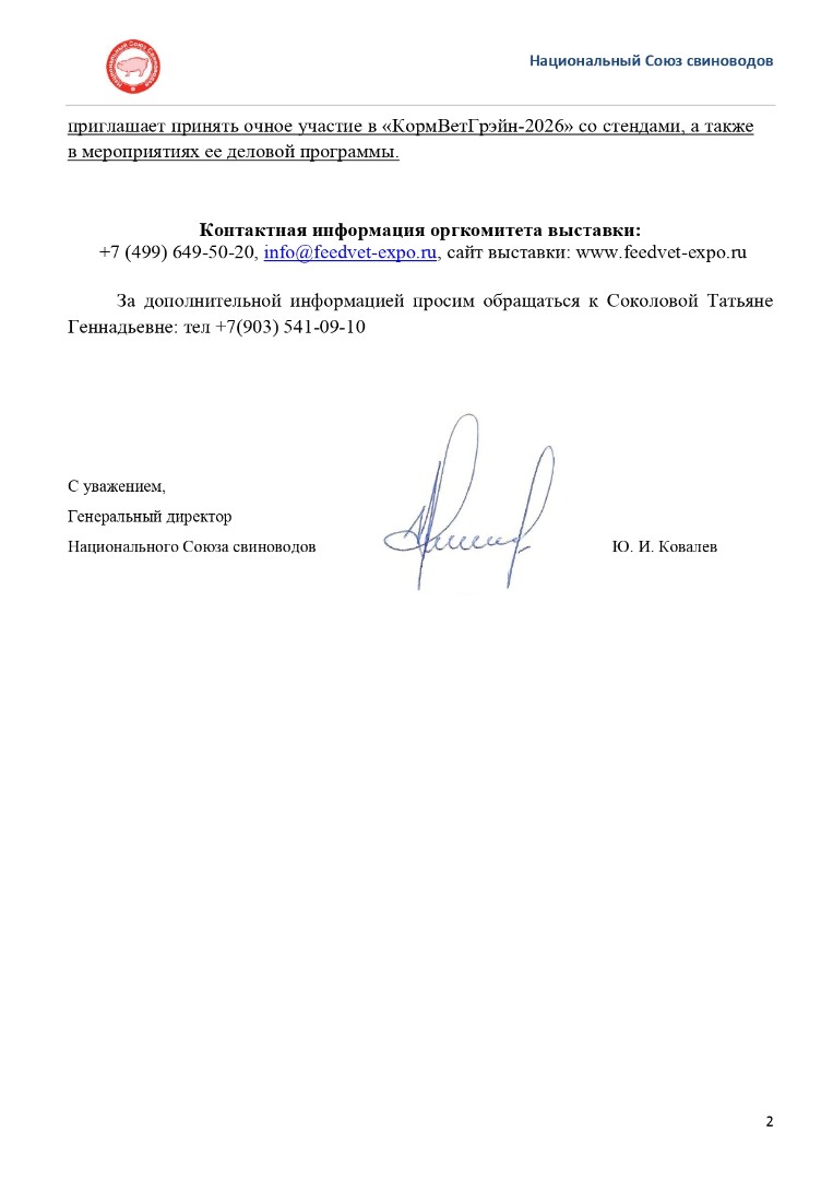Национальный союз свиноводов приглашает к участию в "КормВетГрэйн-2026"